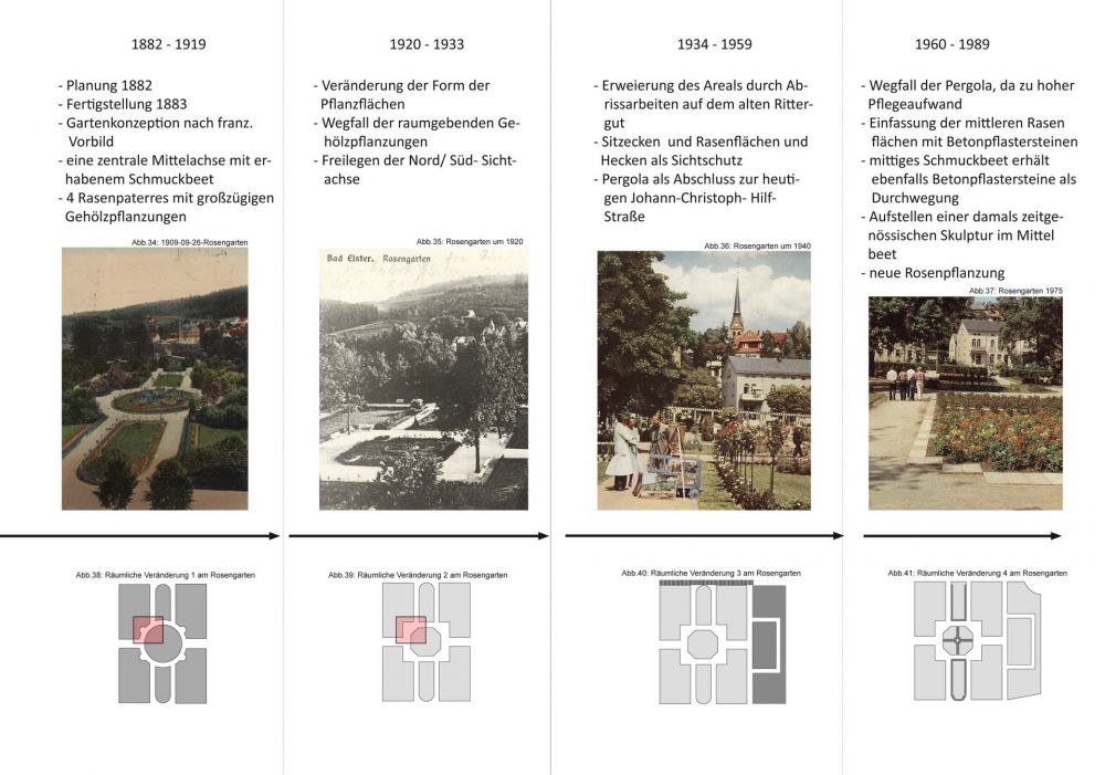 (zu den Bildern: v.l.n.r. Überlagerung Raumstruktur 1882 mit 2010, Zeitstrahl Rosengarten, Rosengarten um 1912)